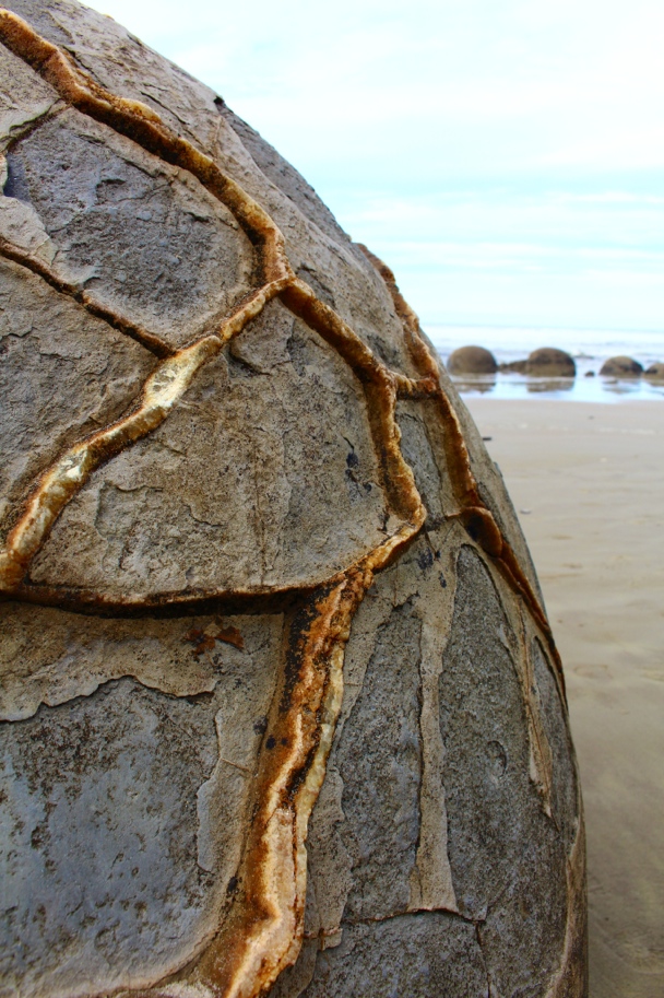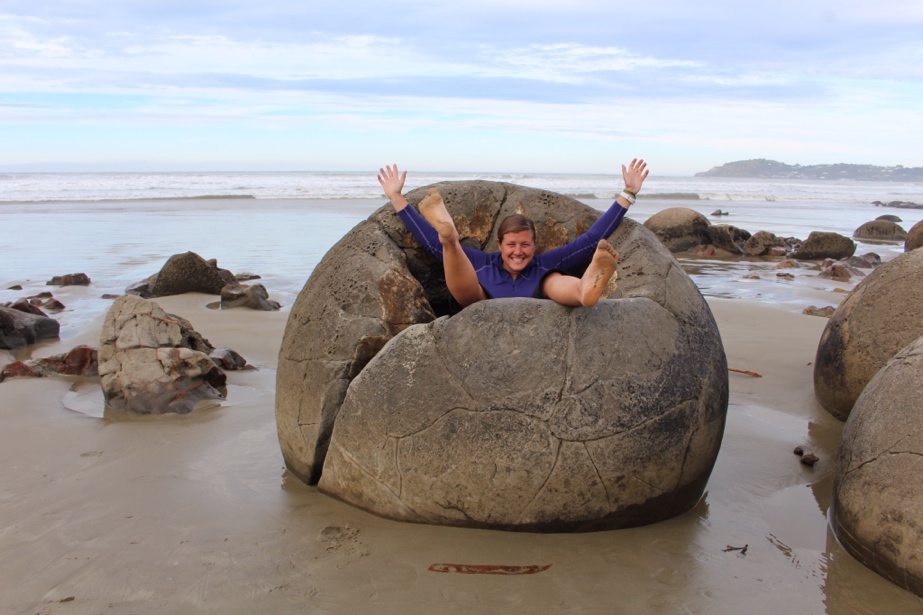 From Aoraki Village we drove east to the world-famous Moeraki (moe-racky) Boulders. These unique spheres of rock are advertised as the “oddest thing you’ll discover on a beach anywhere in the world”, so for us, it was a must-see attraction! We arrived at mid-tide with just enough boulders popping out of the water (and the sand) for us to have some fun!
