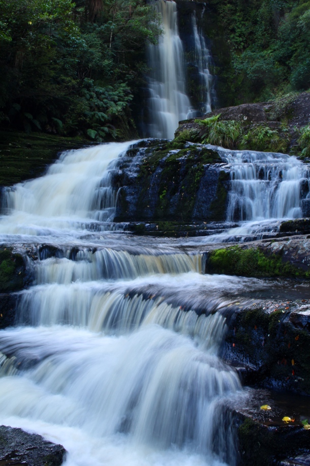 From Nugget Point we continued southward until we found the isolated Purakaunui (purra-cow-nui) Bay campsite. The next morning, with the sun breaking through the rain clouds, we set out for Purakaunui Falls. A quick ten minute stroll and an even quicker photography session at this small falls was all we needed to admire it’s beauty before we moved on to the more popular McLeans Falls.