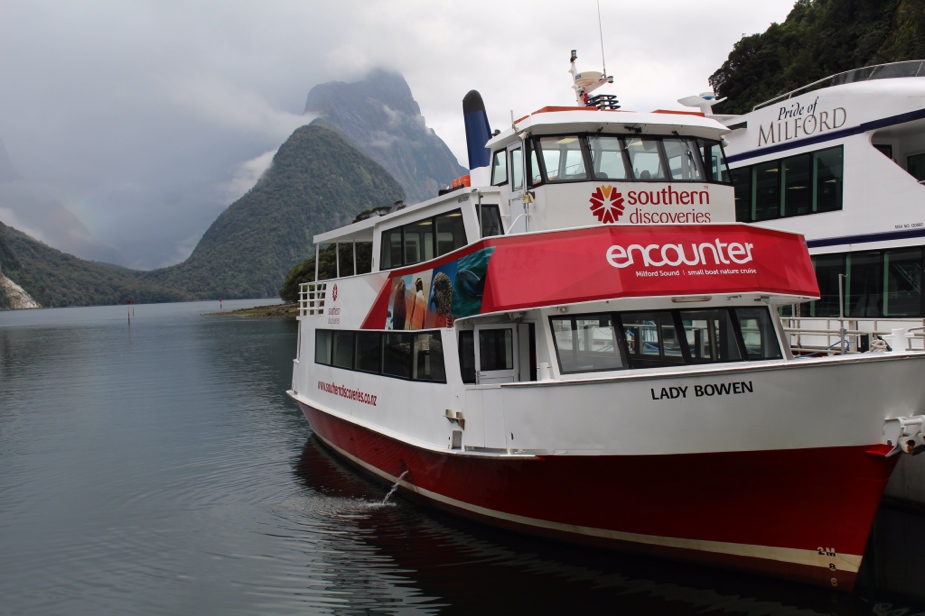 The star of The Fiordlands National Park is undoubtedly Milford Sound. The 13-kilometer-long (18-mile-long) fjord is characterized by rainforest-coated peaks rising from sea-level, spontaneous silver-threaded waterfalls, cascading year-round waterfalls, such as Bowen Falls (520 feet) and Stirling Falls, and, of course, tourists. Being tourists ourselves, we decided that a cruise on Milford Sound was something we had to do, so we hopped on Southern Discoveries Lady Bowen and set sail!