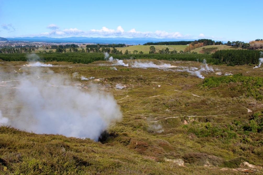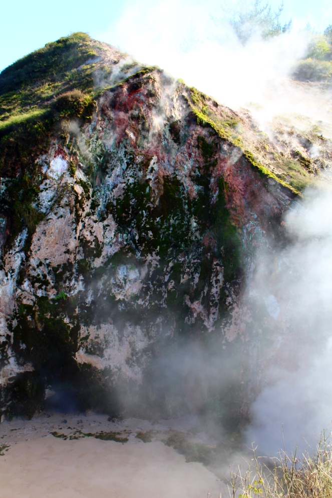 Between our trips to the hot springs we also managed to visit Huka (hooka) Falls – a super blue ribbon of water squeezed between towering walls of basalt before spilling over a 15 meter (50 feet) ledge! Being one of the most popular attractions near Taupo this site is always mobbed, so our visit lasted no more than 15-minutes before we ventured to the geothermal attraction known as Craters of the Moon ($8 per person). Meandering through the park we encountered foul-smelling (aka sulfur-spewing) and hissing fumaroles and craters with “unearthly” characteristics!